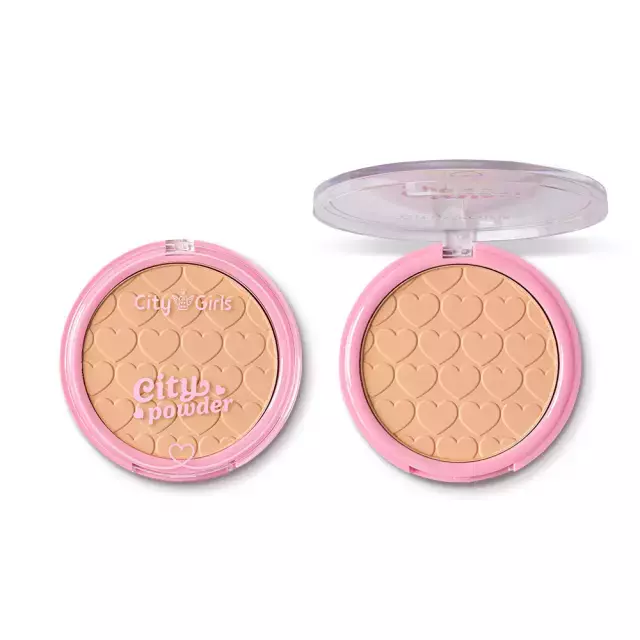 City Powder é o pó compacto que é a sua cara e a da City Girls também! Com a embalagem super fofa, toda rosinha e com relevos de coração, traz a identidade visual bem girly e divertida da City! Além da beleza e do charme que a embalagem traz, o pó compacto também é maravilhoso e vai te deixar livre da oleosidade durante seu dia! Possui a textura bem fininha, perfeita para selar todas as áreas do rosto que deseja matificar, sem marcar poros ou texturas da pele! Além disso, ele entrega cobertura e cor, dando um "boost" a mais no efeito da sua base e corretivo, deixando a pele com um aspecto mais uniforme e bonito!